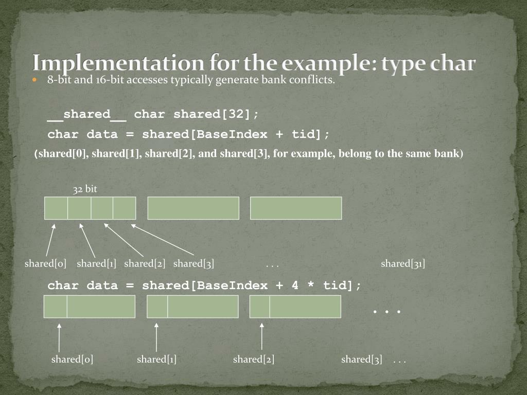 Implementation for the example: type char for (int m = 0; m < (A.width / BLOCK_SIZE); ++m) { Matrix Asub = GetSubMatrix(A, blockRow, m); Matrix Bsub = GetSubMatrix(B, m, blockCol); __shared__ char As[BLOCK_SIZE * 4][BLOCK_SIZE * 4]; __shared__ char Bs[BLOCK_SIZE * 4][BLOCK_SIZE * 4]; As[row * 4][col * 4] = GetElement(Asub, row, col); Bs[row * 4][col * 4] = GetElement(Bsub, row, col); __syncthreads(); for (int e = 0; e < BLOCK_SIZE; ++e) { Cvalue+= As[row * 4][e * 4] * Bs[e * 4][col * 4]; } __syncthreads(); }