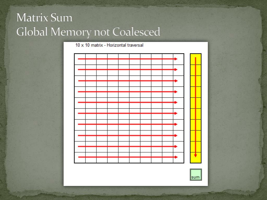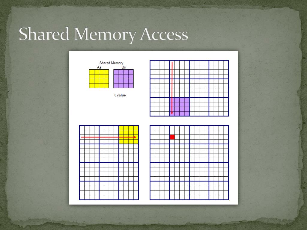 Global Memory Implementationkernel code __global__ void kernel(Matrix A, Matrix B, Matrix C) { int y = threadIdx.x + blockIdx.x * blockDim.x; int x = threadIdx.y + blockIdx.y * blockDim.y; float sum = 0; if (x < C.row && y < C.col) { for (int k = 0; k < A.col; k++) { sum += A.GetValue(x, k) * B.GetValue(k, y); } C.SetValue(x, y, sum); } } Shared Memory Implementation shown in the next page