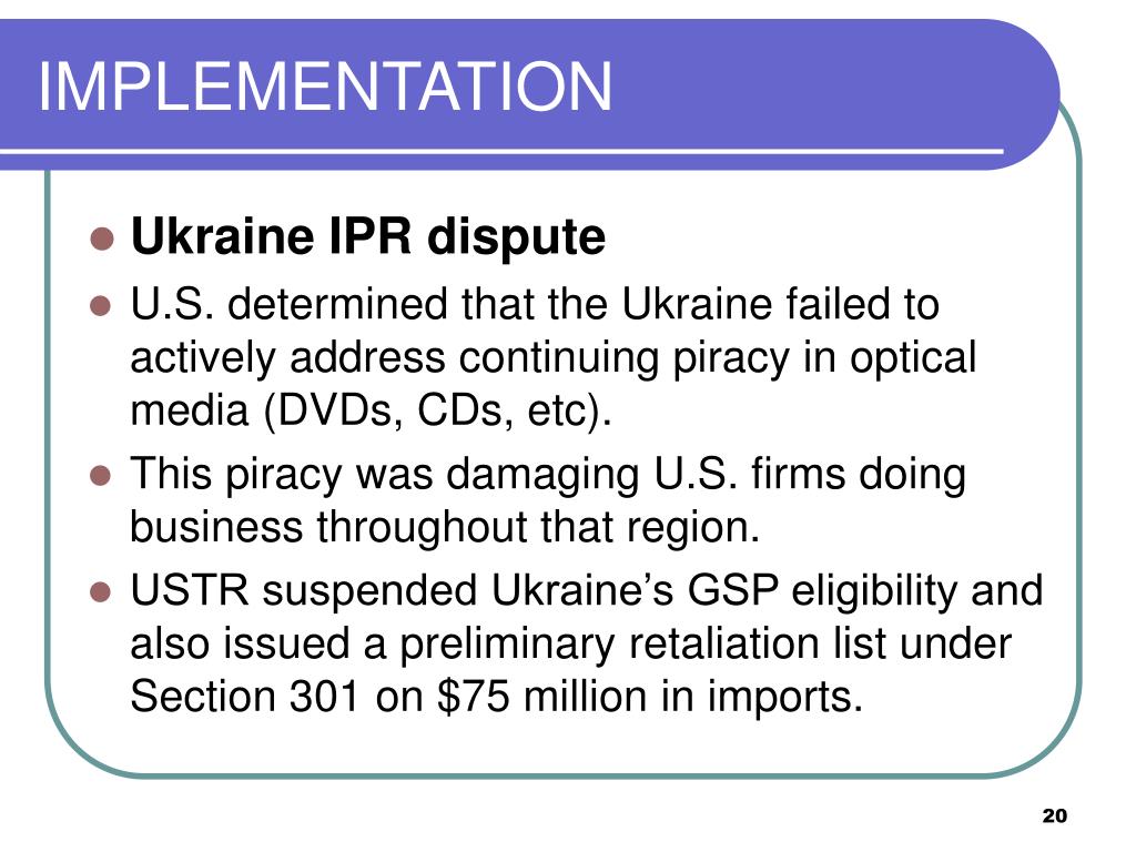 IMPLEMENTATION • Ukraine IPR dispute • U.S. determined that the Ukraine failed to actively address continuing piracy in optical media (DVDs, CDs, etc). • This piracy was damaging U.S. firms doing business throughout that region. • USTR suspended Ukraine’s GSP eligibility and also issued a preliminary retaliation list under Section 301 on $75 million in imports.
