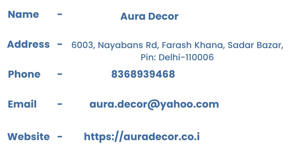 Name - Aura Decor Address - 6003, Nayabans Rd, Farash Khana, Sadar Bazar, Pin: Delhi-110006 Phone - 8368939468 Email - aura.decor@yahoo.com Website - https://auradecor.co.i