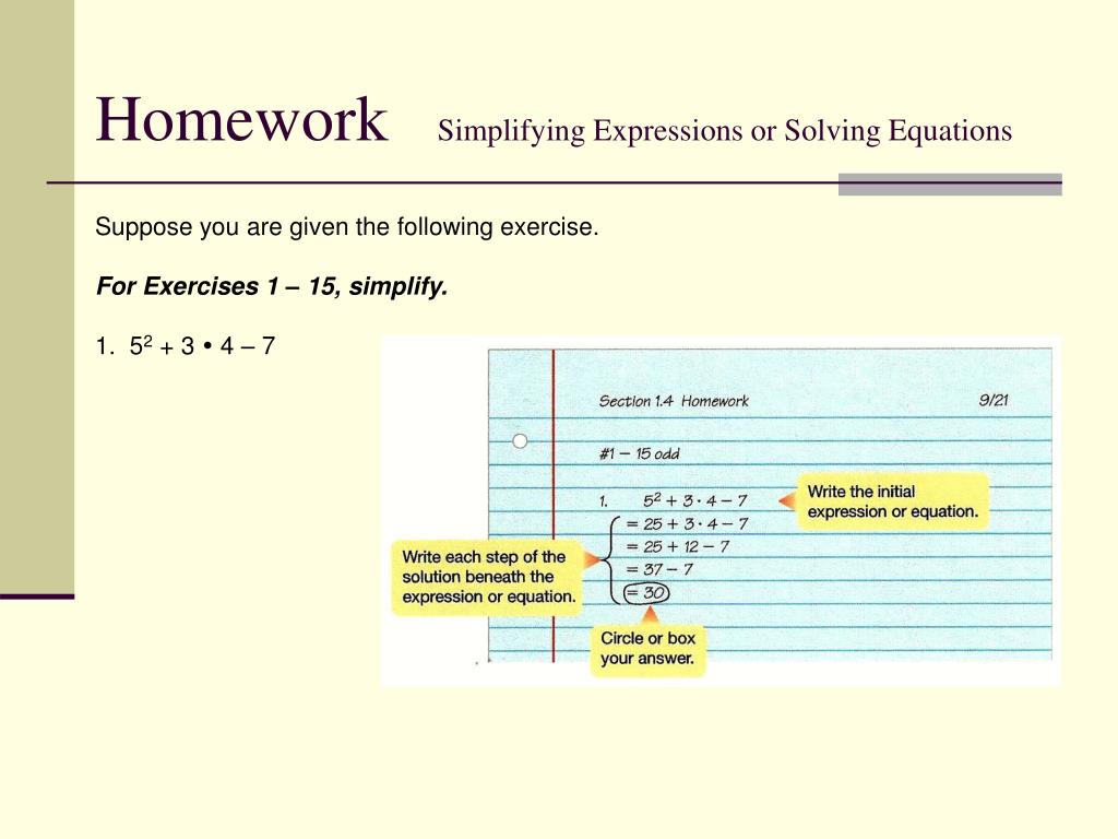 Homework Simplifying Expressions or Solving Equations Suppose you are given the following exercise. For Exercises 1 – 15, simplify. 1. 52 + 3 4 – 7
