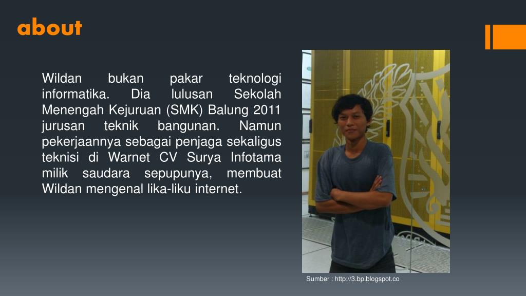 about Wildanbukanpakarteknologiinformatika. DialulusanSekolahMenengahKejuruan (SMK) Balung 2011 jurusanteknikbangunan. Namunpekerjaannyasebagaipenjagasekaligusteknisi di Warnet CV Surya Infotamamiliksaudarasepupunya, membuatWildanmengenallika-liku internet. Sumber : http://3.bp.blogspot.co