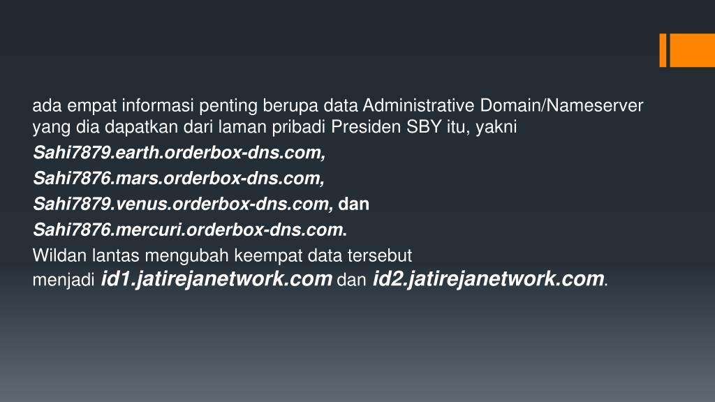adaempatinformasipentingberupa data Administrative Domain/Nameserver yang diadapatkandarilamanpribadiPresiden SBY itu, yakni Sahi7879.earth.orderbox-dns.com, Sahi7876.mars.orderbox-dns.com, Sahi7879.venus.orderbox-dns.com,dan Sahi7876.mercuri.orderbox-dns.com. Wildanlantasmengubahkeempat data tersebutmenjadiid1.jatirejanetwork.comdanid2.jatirejanetwork.com.