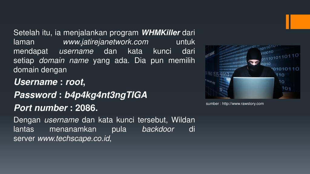 Setelahitu, iamenjalankanprogram WHMKillerdarilamanwww.jatirejanetwork.comuntukmendapatusernamedan kata kuncidarisetiapdomain name yang ada. Dia pun memilih domain dengan Username :root, Password :b4p4kg4nt3ngTIGA Port number : 2086. Denganusernamedan kata kuncitersebut, Wildanlantasmenanamkan pula backdoor di server www.techscape.co.id, sumber : http://www.rawstory.com