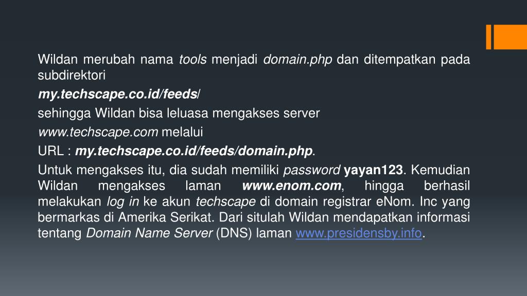 Wildanmerubahnama toolsmenjadidomain.phpdanditempatkanpadasubdirektoriWildanmerubahnama toolsmenjadidomain.phpdanditempatkanpadasubdirektori my.techscape.co.id/feeds/ sehinggaWildanbisaleluasamengakses server www.techscape.commelalui URL : my.techscape.co.id/feeds/domain.php. Untukmengaksesitu, diasudahmemilikipassword yayan123. KemudianWildanmengakseslamanwww.enom.com, hinggaberhasilmelakukanlog in keakuntechscape di domain registrar eNom. Inc yang bermarkas di AmerikaSerikat. Dari situlahWildanmendapatkaninformasitentangDomain Name Server (DNS) lamanwww.presidensby.info.