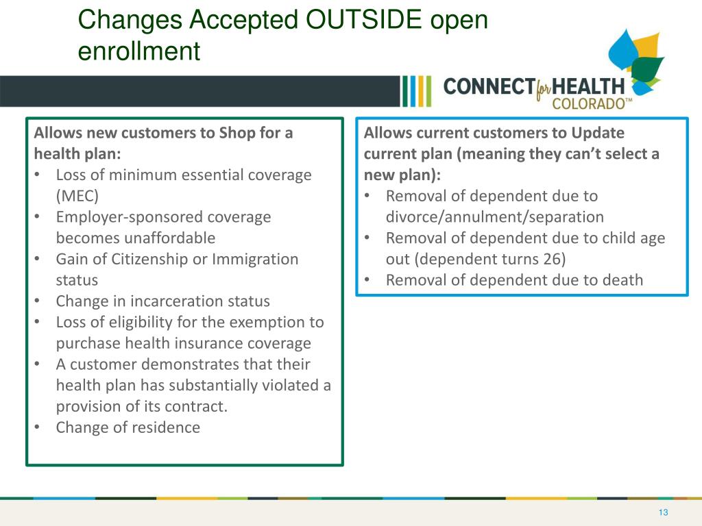 Changes Accepted OUTSIDE open enrollment • Allows current customers to Update current plan (meaning they can’t select a new plan): • Removal of dependent due to divorce/annulment/separation • Removal of dependent due to child age out (dependent turns 26) • Removal of dependent due to death • Allows new customers to Shop for a health plan: • Loss of minimum essential coverage (MEC) • Employer-sponsored coverage becomes unaffordable • Gain of Citizenship or Immigration status • Change in incarceration status • Loss of eligibility for the exemption to purchase health insurance coverage • A customer demonstrates that their health plan has substantially violated a provision of its contract. • Change of residence