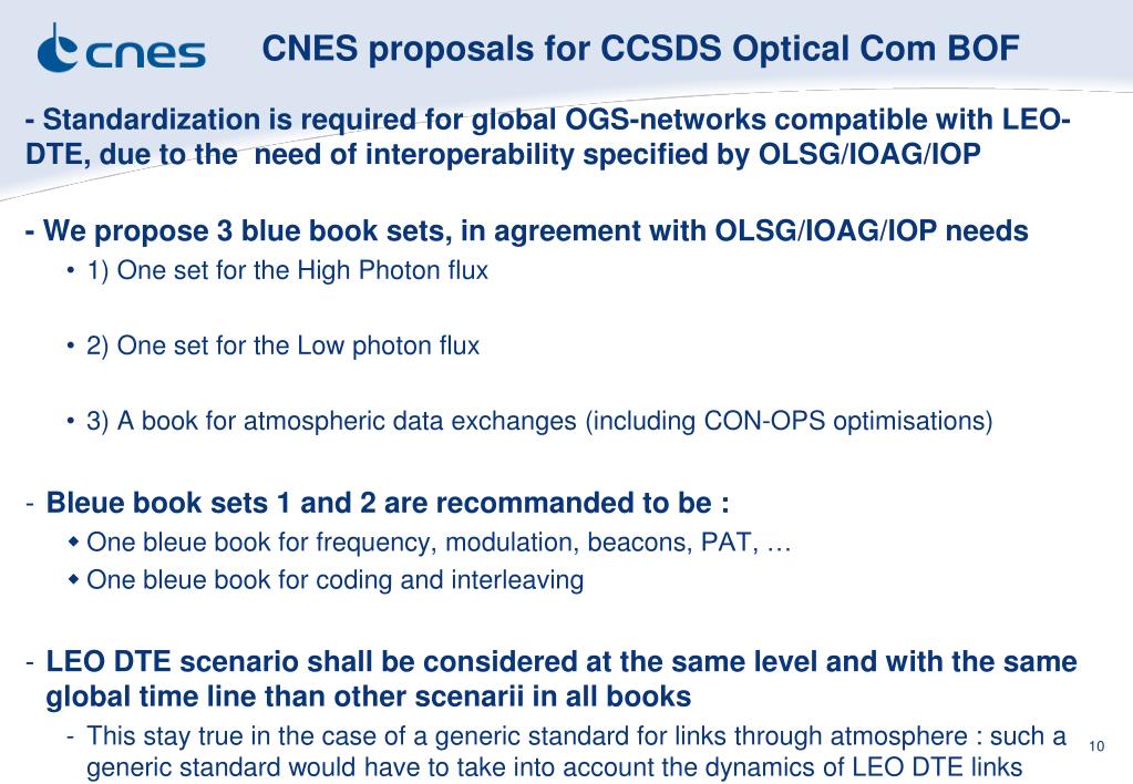 CNES proposals for CCSDS Optical Com BOF - Standardizationisrequiredfor global OGS-networks compatiblewith LEO-DTE, due totheneedofinteroperabilityspecifiedby OLSG/IOAG/IOP - Wepropose 3bluebooksets, in agreementwith OLSG/IOAG/IOP needs • 1) Onesetforthe High Photon flux • 2) Onesetforthe Low photonflux • 3) A bookforatmosphericdataexchanges (including CON-OPS optimisations) • Bleue book sets 1 and 2 are recommanded to be : • One bleue book for frequency, modulation, beacons, PAT, … • One bleue book for coding and interleaving • LEO DTE scenario shallbeconsideredat the samelevel and with the same global time line thanother scenarii in all books • This staytrue in the case of a generic standard for links throughatmosphere : such a generic standard would have to takeintoaccount the dynamics of LEO DTE links