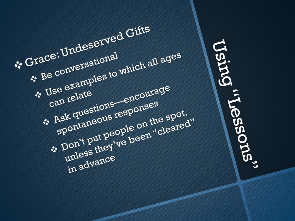 Using “Lessons” • Grace: Undeserved Gifts • Be conversational • Use examples to which all ages can relate • Ask questions—encourage spontaneous responses • Don’t put people on the spot, unless they’ve been “cleared” in advance