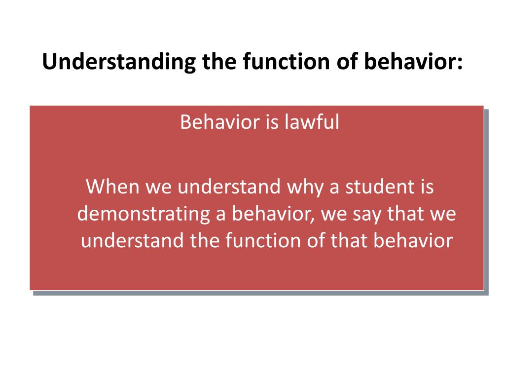Understanding the function of behavior: Behavior is lawful When we understand why a student is demonstrating a behavior, we say that we understand the function of that behavior