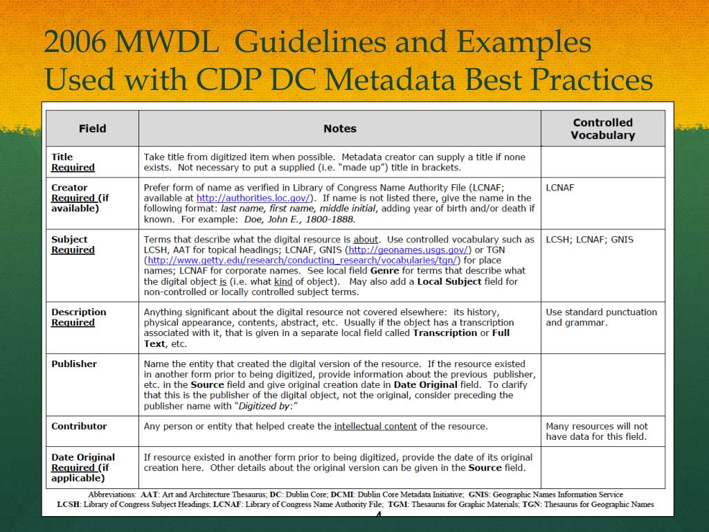 2006 MWDL Guidelines and Examples Used with CDP DC Metadata Best Practices