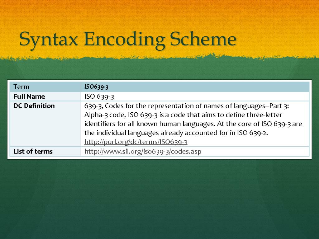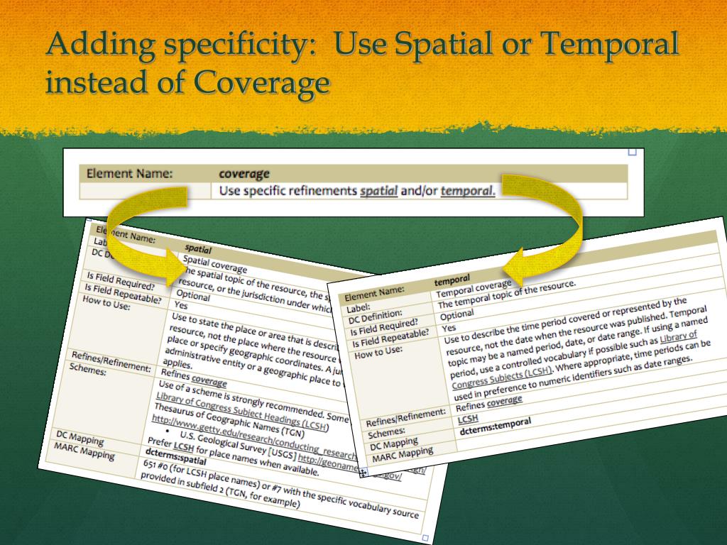 What’s new – part 2 • To facilitate digital preservation, new optional preservation fields (Section IV) about archival master files • New optional Dublin Core elements included: abstract, alternative, extent, isPartOf, spatial, tableofContents, temporal • New role refinement for contributor • More specific temporal and spatial elements instead of coverage • More guidance on vocabularies and encoding schemes throughout, with tables for the major schemes provided in new sections (V and VI).
