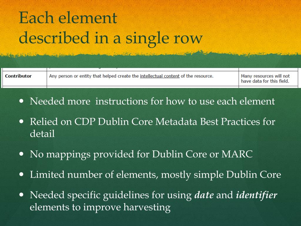 Each element described in a single row • Needed more instructions for how to use each element • Relied on CDP Dublin Core Metadata Best Practices for detail • No mappings provided for Dublin Core or MARC • Limited number of elements, mostly simple Dublin Core • Needed specific guidelines for using date and identifier elements to improve harvesting