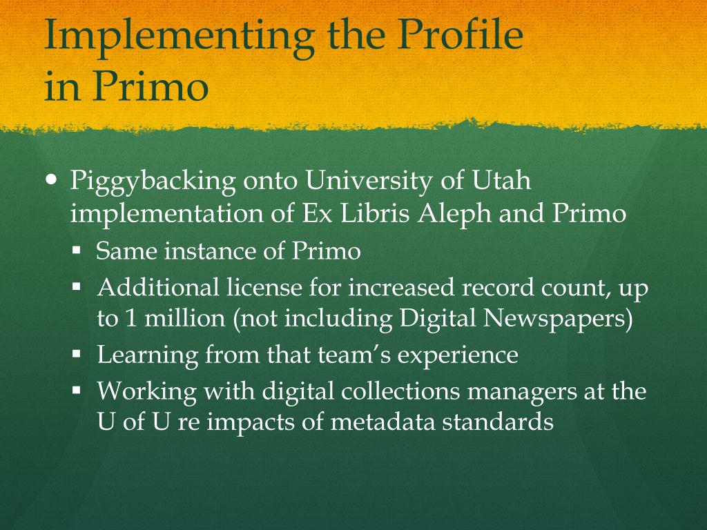 Implementing the Profile in Primo • Piggybacking onto University of Utah implementation of Ex Libris Aleph and Primo • Same instance of Primo • Additional license for increased record count, up to 1 million (not including Digital Newspapers) • Learning from that team’s experience • Working with digital collections managers at the U of U re impacts of metadata standards