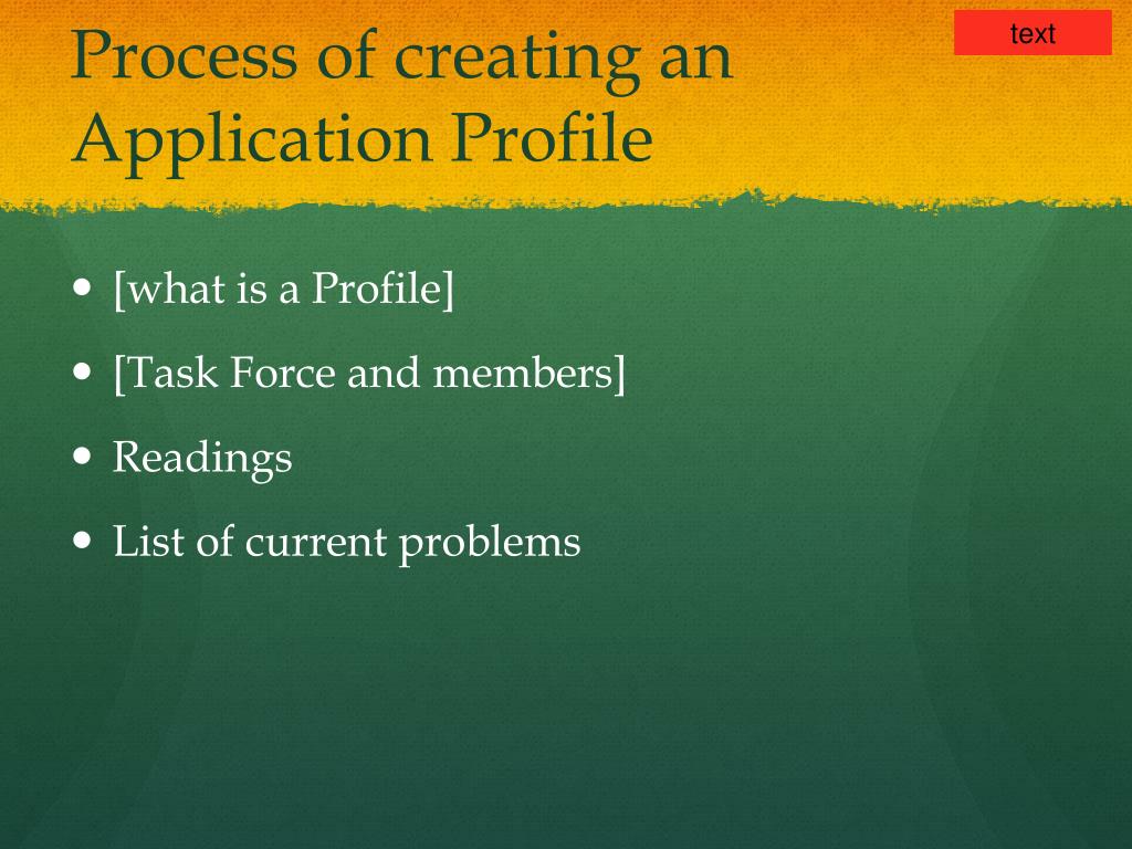 Process of creating an Application Profile [what is a Profile] [Task Force and members] Readings List of current problems text