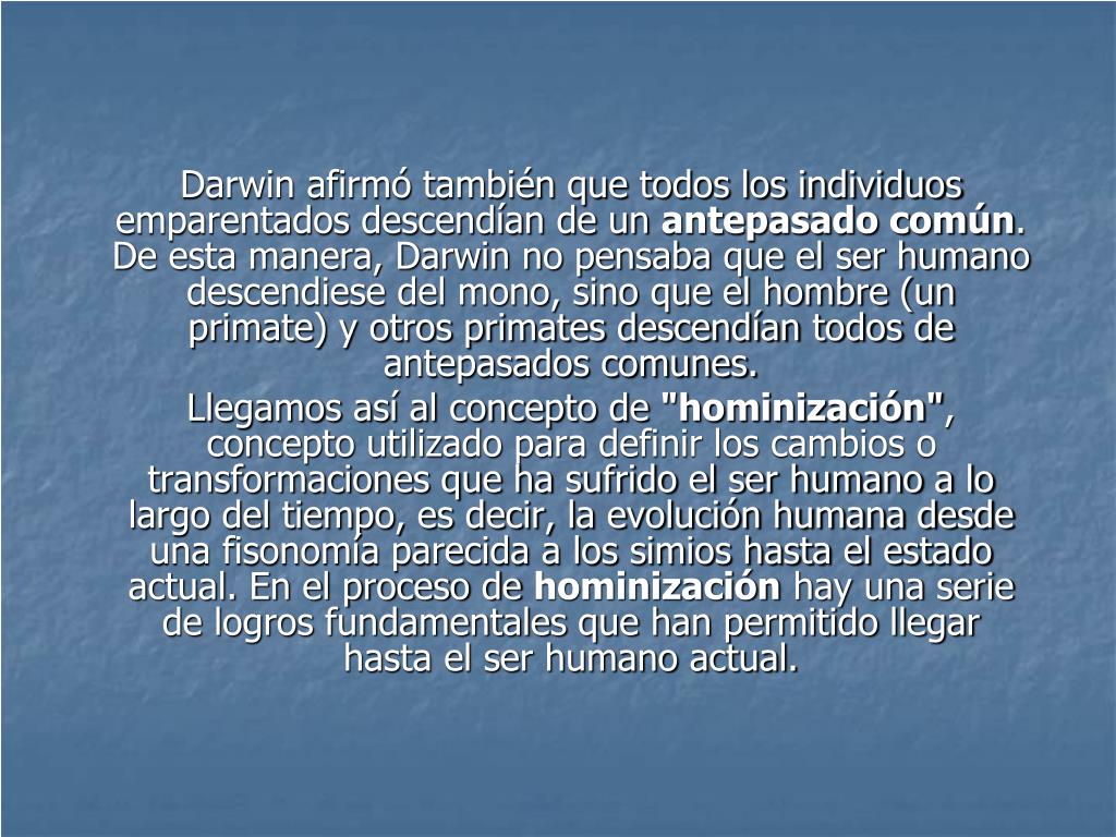 Darwin afirmó también que todos los individuos emparentados descendían de un antepasado común. De esta manera, Darwin no pensaba que el ser humano descendiese del mono, sino que el hombre (un primate) y otros primates descendían todos de antepasados comunes. Llegamos así al concepto de "hominización", concepto utilizado para definir los cambios o transformaciones que ha sufrido el ser humano a lo largo del tiempo, es decir, la evolución humana desde una fisonomía parecida a los simios hasta el estado actual. En el proceso de hominización hay una serie de logros fundamentales que han permitido llegar hasta el ser humano actual.