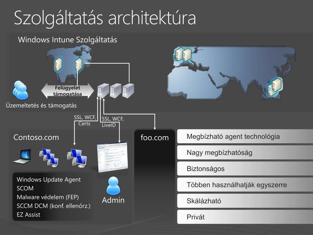 Szolgáltatás architektúra Windows IntuneSzolgáltatás Felügyelet támogatása Üzemeltetés és támogatás SSL, WCF, Certs SSL, WCF, LiveID Contoso.com • foo.com Megbízható agent technológia Nagy megbízhatóság Biztonságos • Windows Update Agent • SCOM • Malware védelem (FEP) • SCCM DCM (konf. ellenőrz.) • EZ Assist Többen használhatják egyszerre Admin Skálázható Privát