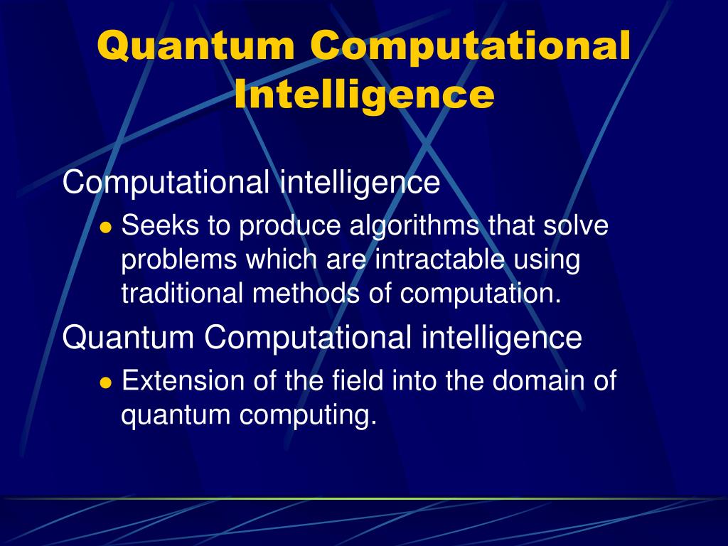 Quantum Computational Intelligence Computational intelligence • Seeks to produce algorithms that solve problems which are intractable using traditional methods of computation. Quantum Computational intelligence • Extension of the field into the domain of quantum computing.