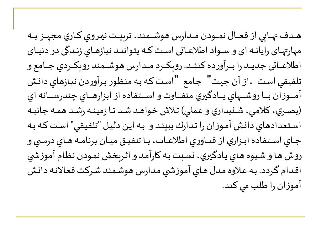 هدف نهايي از فعال نمودن مدارس هوشمند، تربيت نيروي كاري مجهز به مهارتهای رايانه ای و سواد اطلاعاتی است كه بتوانند نيازهاي زندگی در دنيای اطلاعاتی جديد را برآورده كنند. رويكرد مدارس هوشمند رويكردي جامع و تلفيقي است. از آن جهت "جامع" است كه به منظور بـرآوردن نيـازهاي دانـش آمـوزان با روشهاي يادگيري متفاوت و استفاده از ابزارهاي چندرسانه اي (بصري، كلامي، شنيداري و عملي) تلاش خواهد شد تا زمينه رشد همه جانبه استعدادهاي دانش آموزان را تدارك ببيند و به اين دليل "تلفيقي" است كه به جاي استفاده ابزاري از فناوري اطلاعات، با تلفيق ميان برنامه هاي درسي و روش ها و شيوه هاي يادگيري، نسبت به كارآمد و اثربخش نمودن نظام آموزشي اقدام گردد. به علاوه مدل هاي آموزشي مدارس هوشمند شركت فعالانه دانش آموزان را طلب مي كند.