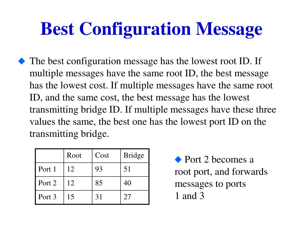 Best Configuration Message • The best configuration message has the lowest root ID. If multiple messages have the same root ID, the best message has the lowest cost. If multiple messages have the same root ID, and the same cost, the best message has the lowest transmitting bridge ID. If multiple messages have these three values the same, the best one has the lowest port ID on the transmitting bridge. • Port 2 becomes a root port, and forwardsmessages to ports 1 and 3