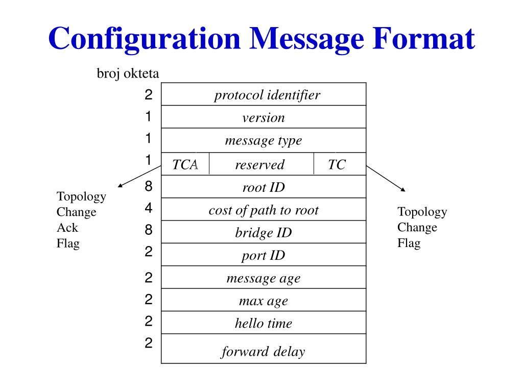 Configuration Message Format broj okteta 2 1 1 1 8 Topology Change Ack Flag 4 Topology Change Flag 8 2 2 2 2 2