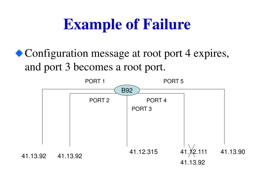 PORT 1 PORT 5 B92 PORT 2 PORT 4 PORT 3 41.12.315 41.12.111 41.13.90 41.14.92 41.14.92 41.14.92 41.14.92 Example of Failure • Configuration message at root port 3 expires, and port 5 becomes a root port.