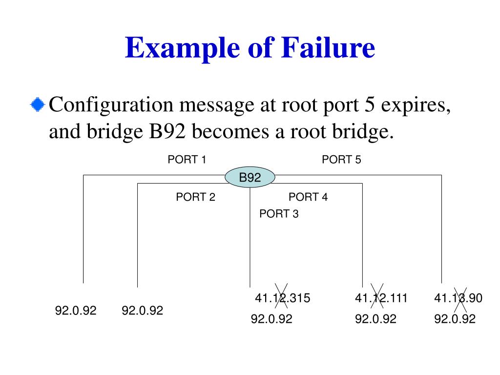PORT 1 PORT 5 B92 PORT 2 PORT 4 PORT 3 41.12.315 41.12.111 41.13.90 92.0.92 92.0.92 92.0.92 92.0.92 92.0.92 Example of Failure • Configuration message at root port 5 expires, and bridge B92 becomes a root bridge.