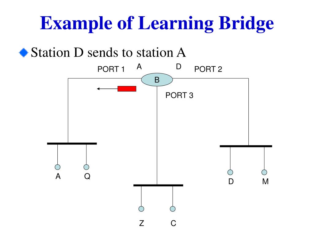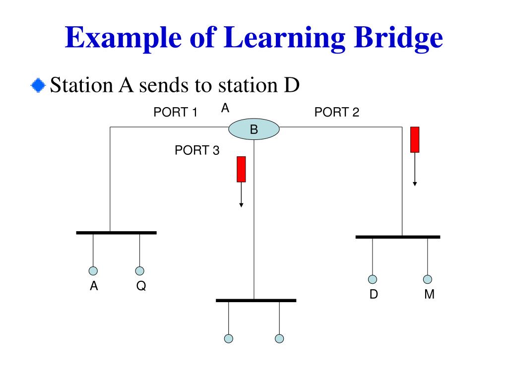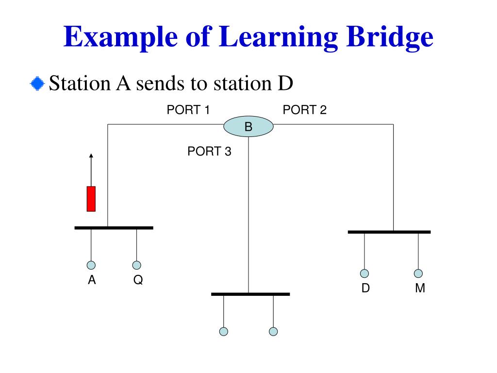 PORT 1 PORT 2 B PORT 3 A Q D M Example of Learning Bridge • Station A sends to station D