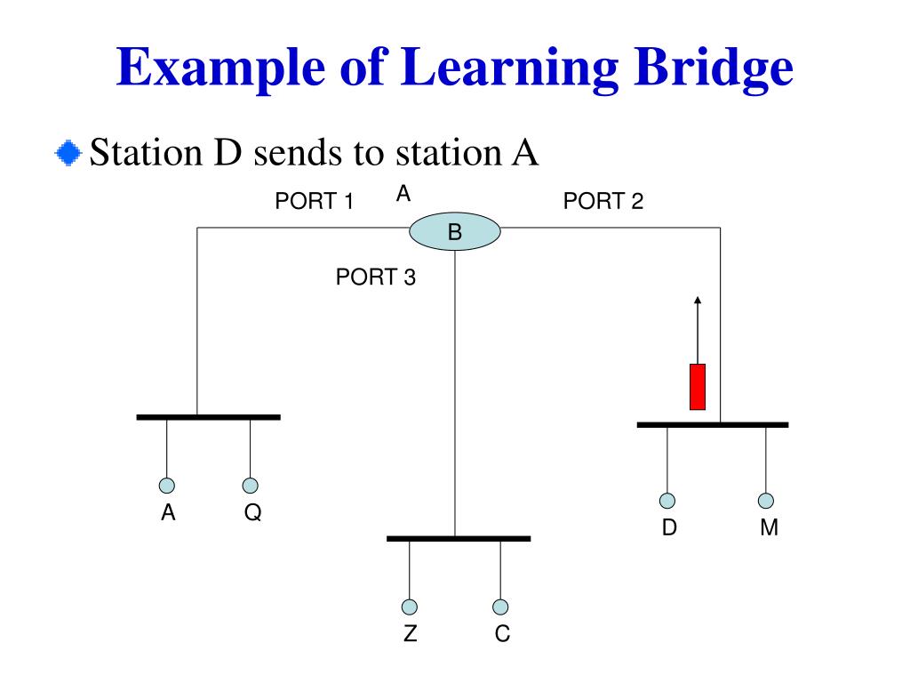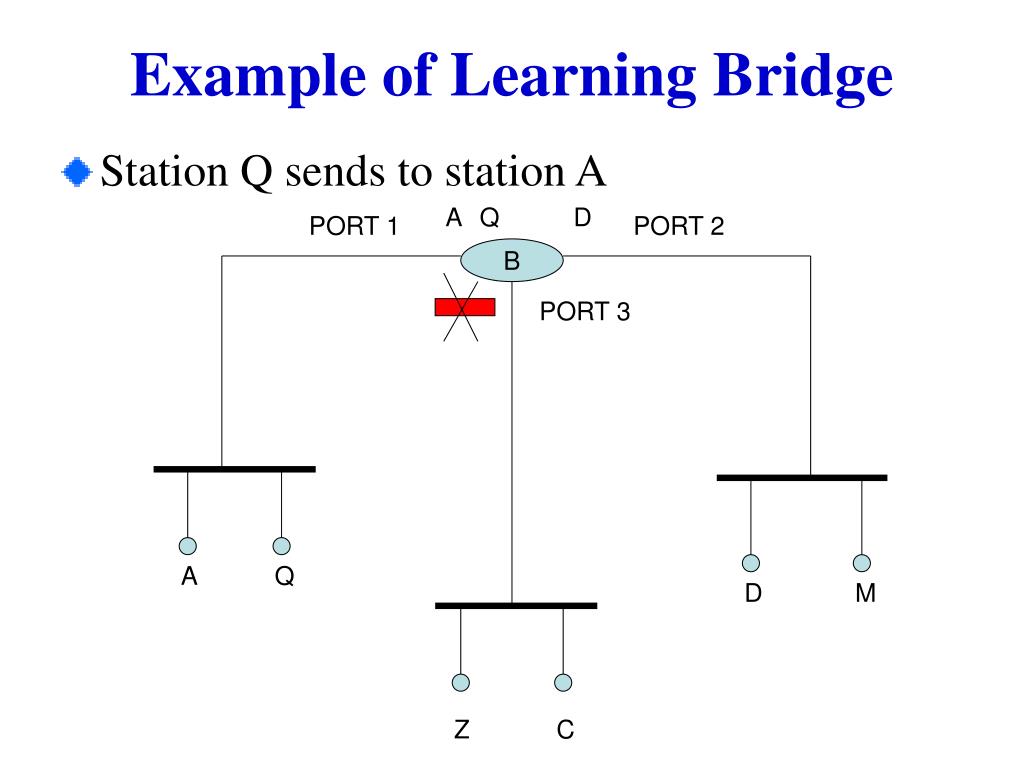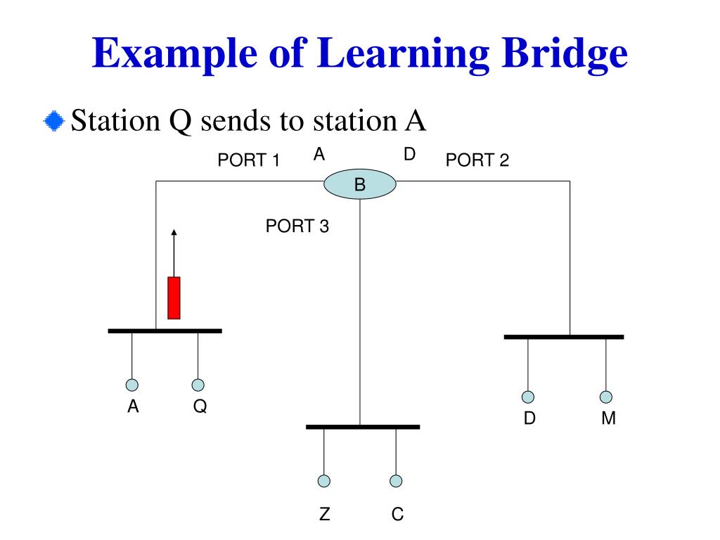 A Q D PORT 1 PORT 2 B PORT 3 A Q D M Z C Example of Learning Bridge • Station Q sends to station A