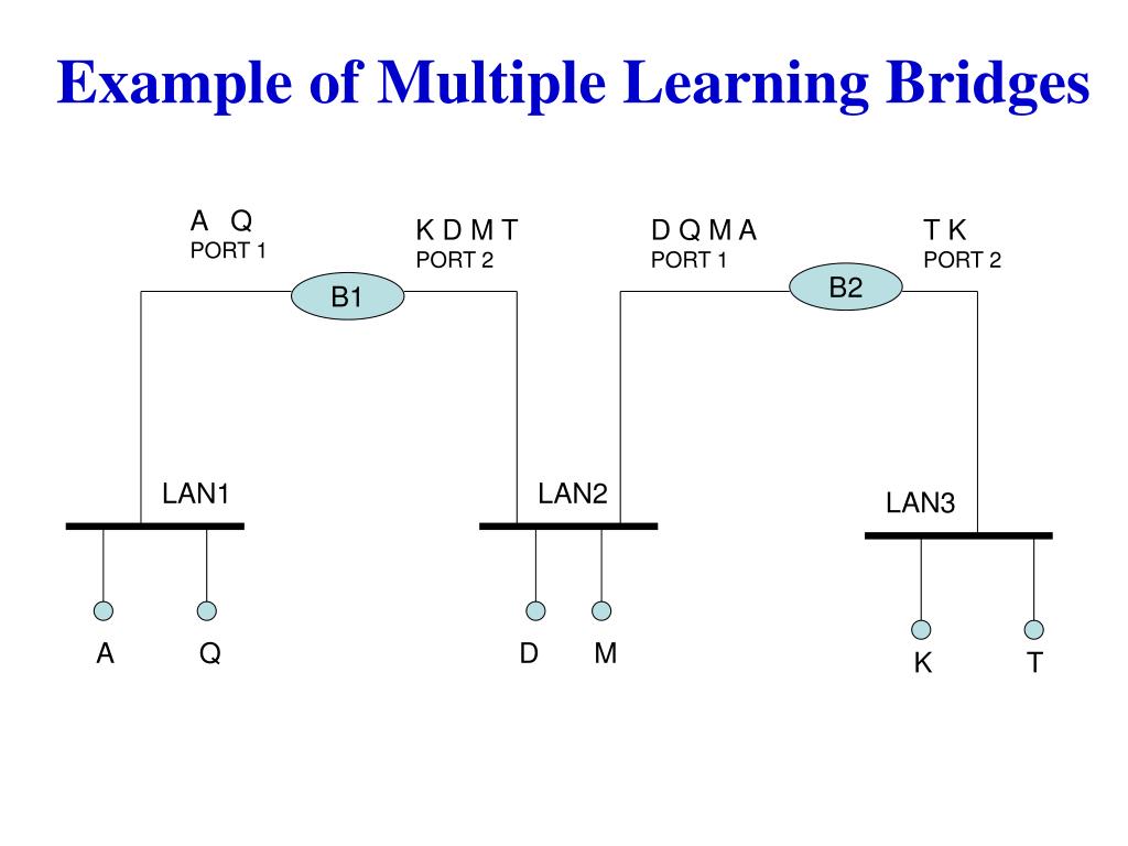 A Q PORT 1 K D M T PORT 2 D Q M A PORT 1 T K PORT 2 B2 B1 LAN1 LAN2 LAN3 A Q D M K T Example of Multiple Learning Bridges