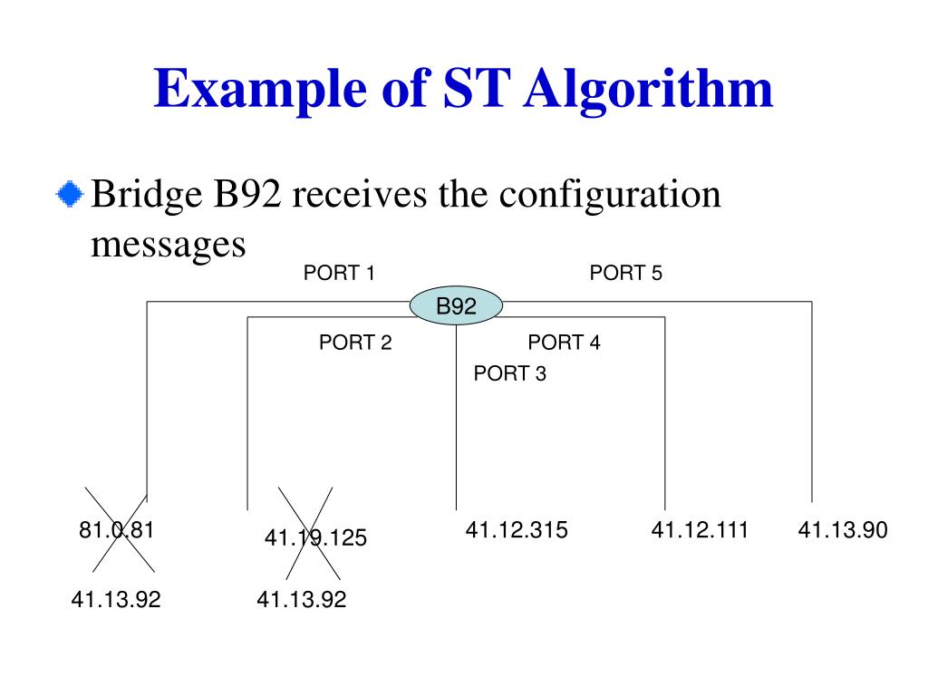 Example of ST Algorithm • Bridge B92 receives the configuration messages PORT 1 PORT 5 B92 PORT 2 PORT 4 PORT 3 81.0.81 41.12.315 41.12.111 41.13.90 41.19.125