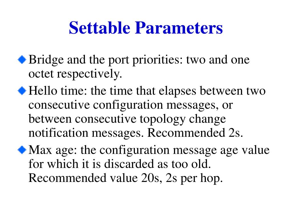 Settable Parameters • Bridge and the port priorities: two and one octet respectively. • Hello time: the time that elapses between two consecutive configuration messages, or between consecutive topology change notification messages. Recommended 2s. • Max age: the configuration message age value for which it is discarded as too old. Recommended value 20s, 2s per hop.