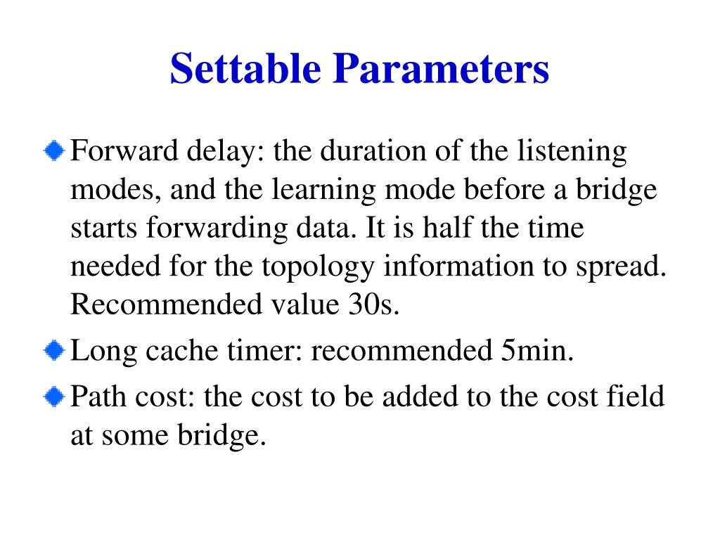 Settable Parameters • Forward delay: the duration of the listening modes, and the learning mode before a bridge starts forwarding data. It is half the time needed for the topology information to spread. Recommended value 30s. • Long cache timer: recommended 5min. • Path cost: the cost to be added to the cost field at some bridge.