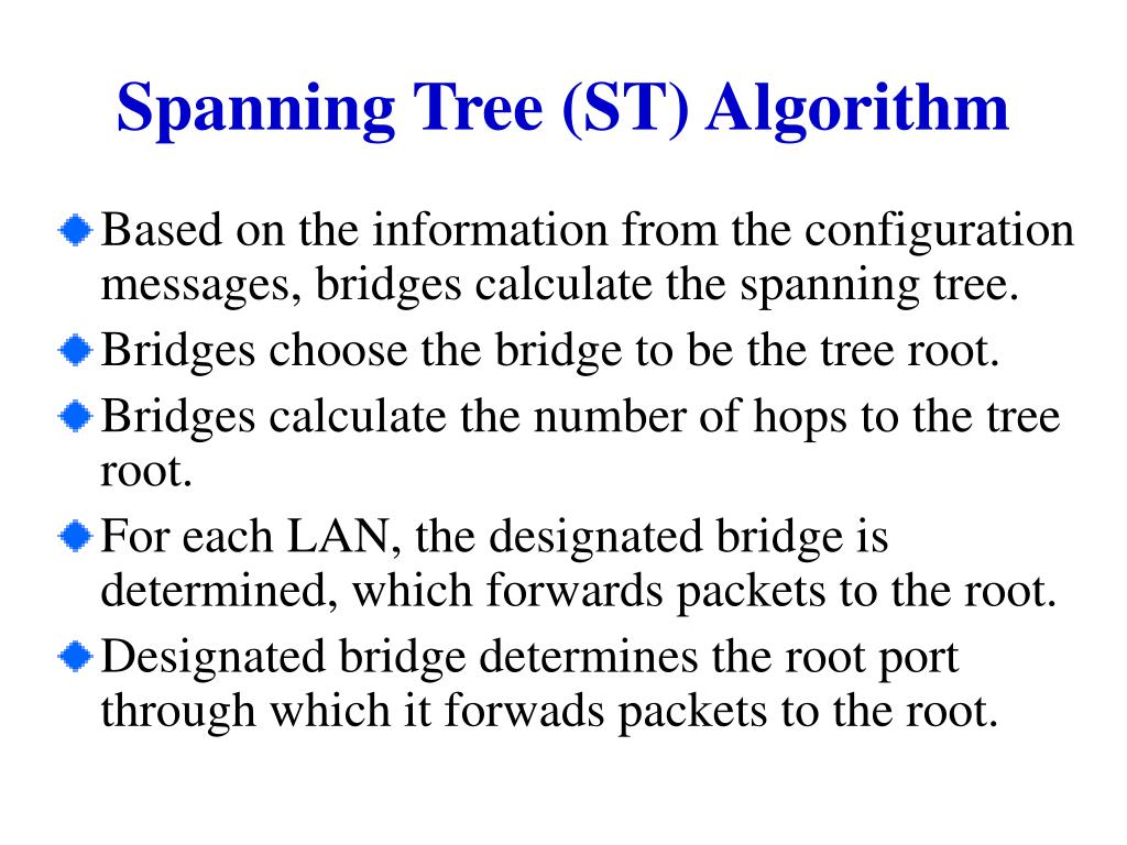Spanning Tree (ST) Algorithm • Based on the information from the configuration messages, bridges calculate the spanning tree. • Bridges choose the bridge to be the tree root. • Bridges calculate the number of hops to the tree root. • For each LAN, the designated bridge is determined, which forwards packets to the root. • Designated bridge determines the root port through which it forwads packets to the root.