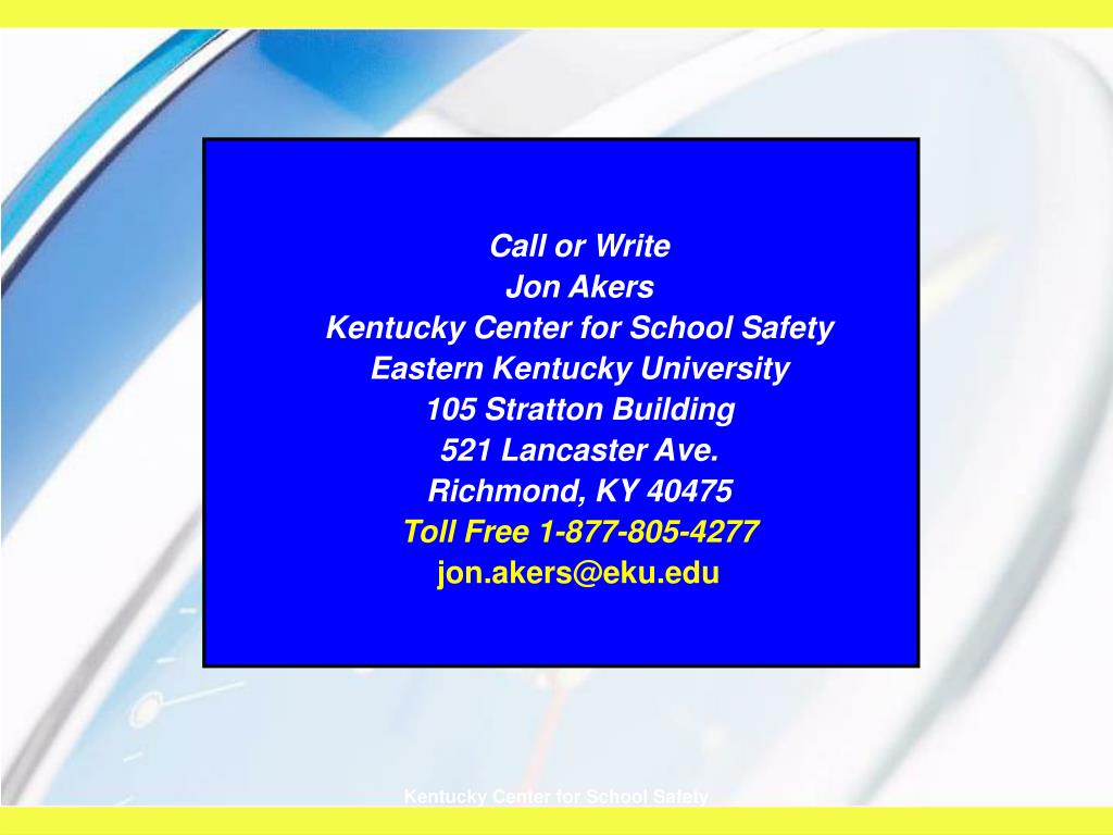 Call or Write • Jon Akers • Kentucky Center for School Safety • Eastern Kentucky University • 105 Stratton Building • 521 Lancaster Ave. • Richmond, KY 40475 • Toll Free 1-877-805-4277 • jon.akers@eku.edu Kentucky Center for School Safety
