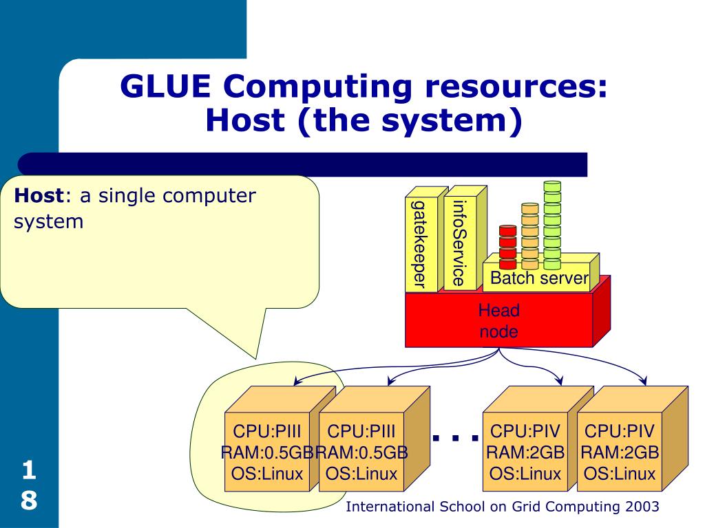 infoService gatekeeper Batch server Head node … CPU:PIV RAM:2GB OS:Linux CPU:PIV RAM:2GB OS:Linux CPU:PIII RAM:0.5GB OS:Linux CPU:PIII RAM:0.5GB OS:Linux GLUE Computing resources:Host (the system) Host: a single computer system International School on Grid Computing 2003