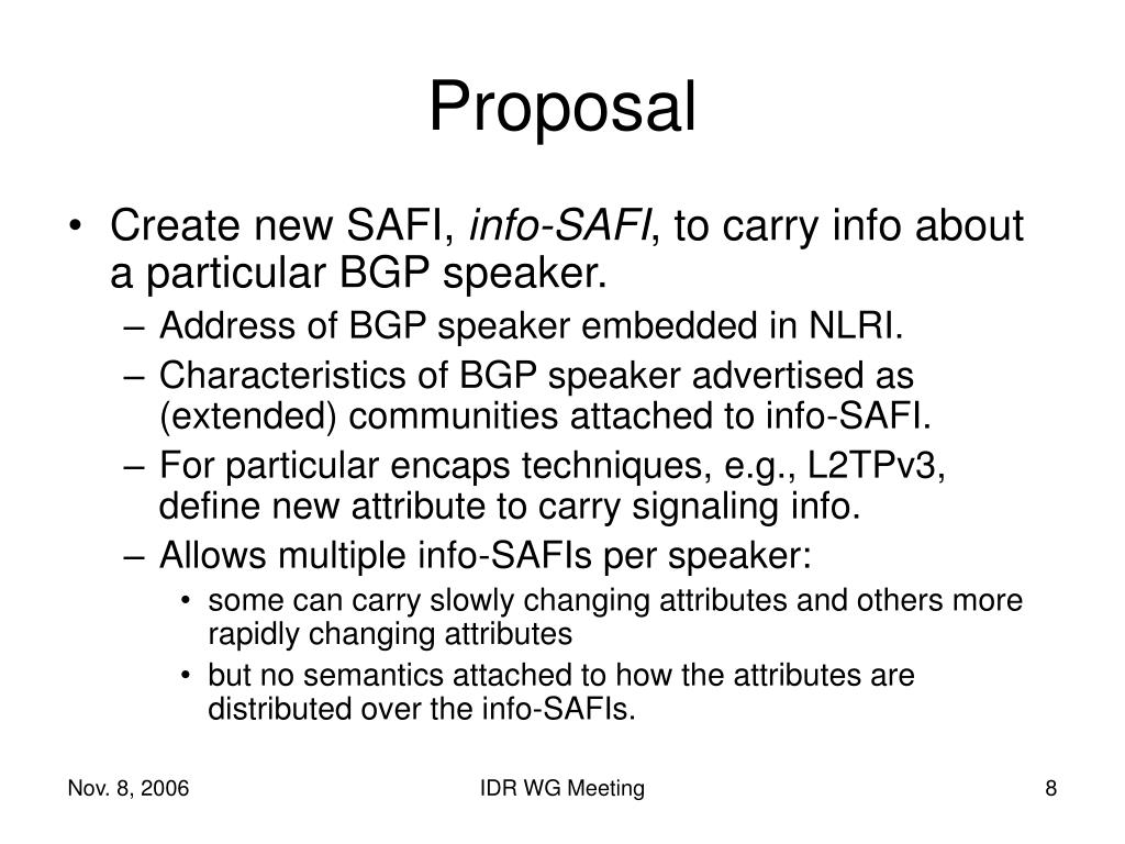 Proposal • Create new SAFI, info-SAFI, to carry info about a particular BGP speaker. • Address of BGP speaker embedded in NLRI. • Characteristics of BGP speaker advertised as (extended) communities attached to info-SAFI. • For particular encaps techniques, e.g., L2TPv3, define new attribute to carry signaling info. • Allows multiple info-SAFIs per speaker: • some can carry slowly changing attributes and others more rapidly changing attributes • but no semantics attached to how the attributes are distributed over the info-SAFIs. IDR WG Meeting