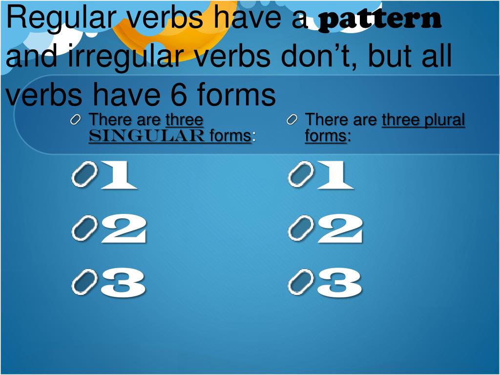 There arethreesingular forms: 1 2 3 There are three plural forms: 1 2 3 Regular verbs have a pattern and irregular verbs don’t, but all verbs have 6 forms