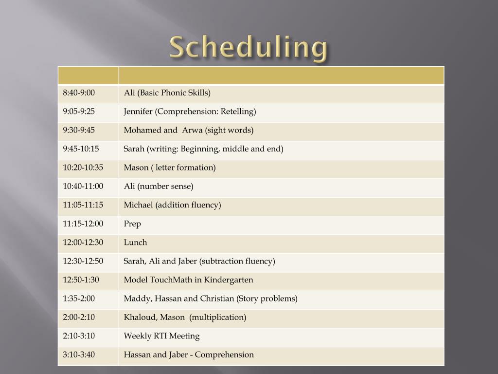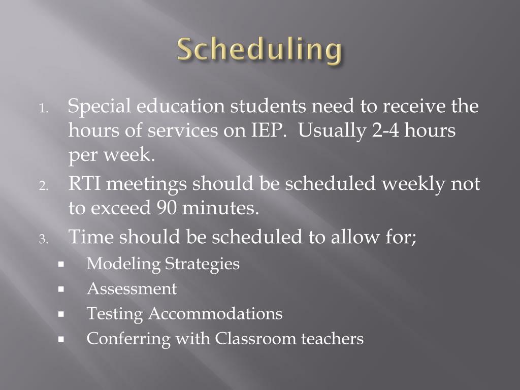 Scheduling • Special education students need to receive the hours of services on IEP. Usually 2-4 hours per week. • RTI meetings should be scheduled weekly not to exceed 90 minutes. • Time should be scheduled to allow for; • Modeling Strategies • Assessment • Testing Accommodations • Conferring with Classroom teachers