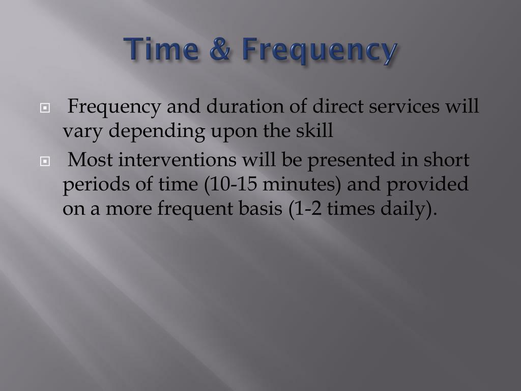 Time & Frequency • Frequency and duration of direct services will vary depending upon the skill • Most interventions will be presented in short periods of time (10-15 minutes) and provided on a more frequent basis (1-2 times daily).