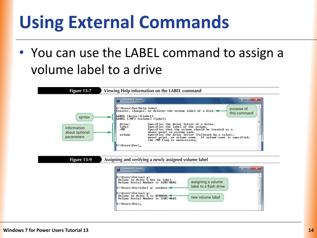Using External Commands • You can use the LABEL command to assign a volume label to a drive Windows 7 for Power Users Tutorial 13