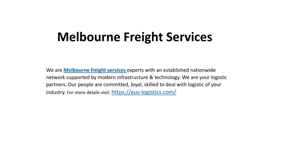 Melbourne Freight Services We are Melbourne freight services experts with an established nationwide network supported by modern infrastructure & technology. We are your logistic partners. Our people are committed, loyal, skilled to deal with logistic of your industry. For more details visit: https://aus-logistics.com/