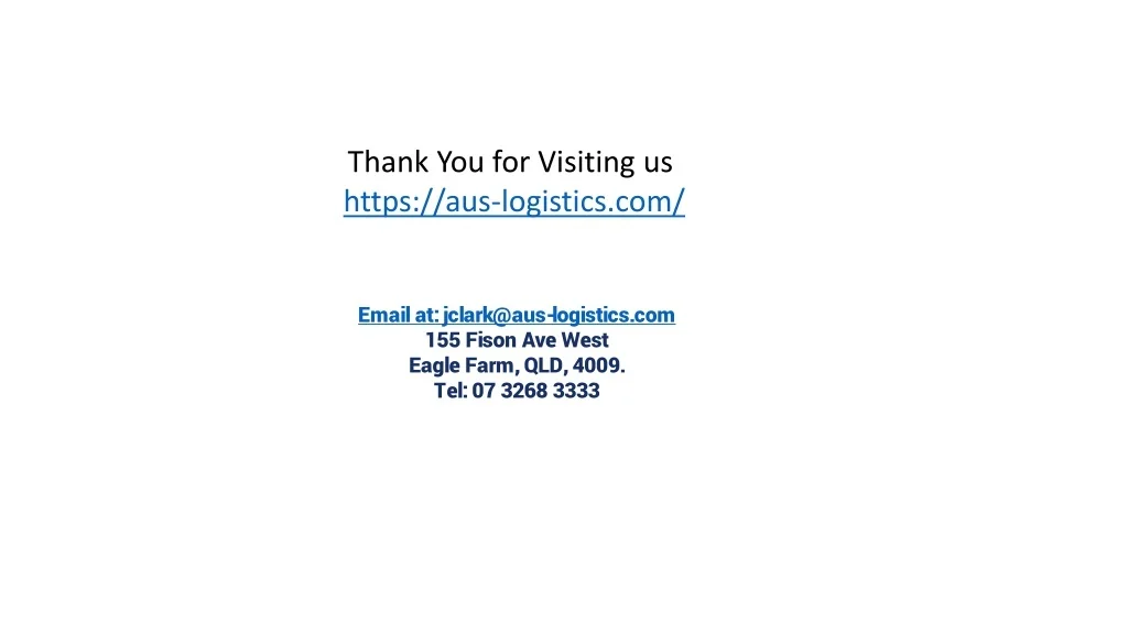Thank You for Visiting us https://aus-logistics.com/ Email at: jclark@aus-logistics.com 155 Fison Ave WestEagle Farm, QLD, 4009.Tel: 07 3268 3333