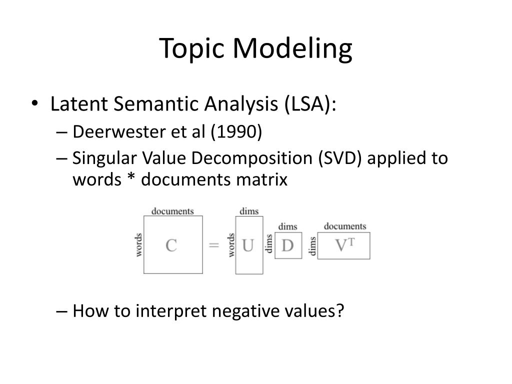 Topic Modeling • Latent Semantic Analysis (LSA): • Deerwesteret al (1990) • Singular Value Decomposition (SVD) applied to words * documents matrix • How to interpret negative values?