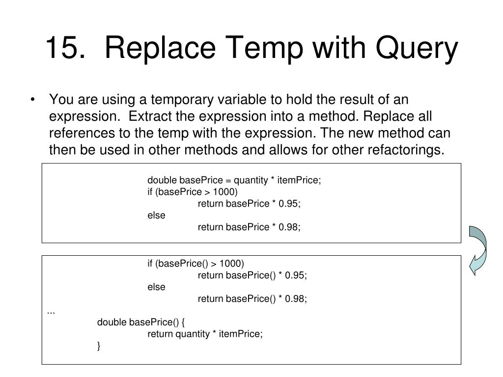 15. Replace Temp with Query • You are using a temporary variable to hold the result of an expression. Extract the expression into a method. Replace all references to the temp with the expression. The new method can then be used in other methods and allows for other refactorings. double basePrice = quantity * itemPrice; if (basePrice > 1000) return basePrice * 0.95; else return basePrice * 0.98; if (basePrice() > 1000) return basePrice() * 0.95; else return basePrice() * 0.98; ... double basePrice() { return quantity * itemPrice; }