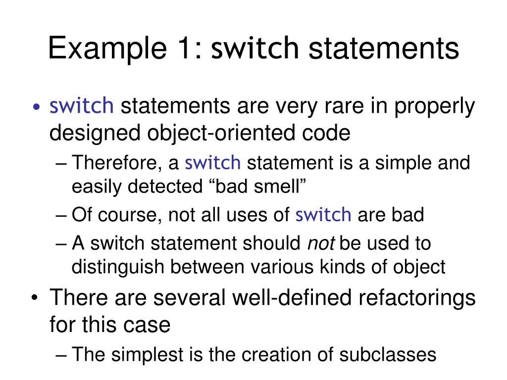 Example 1: switch statements • switch statements are very rare in properly designed object-oriented code • Therefore, a switch statement is a simple and easily detected “bad smell” • Of course, not all uses of switch are bad • A switch statement should not be used to distinguish between various kinds of object • There are several well-defined refactorings for this case • The simplest is the creation of subclasses