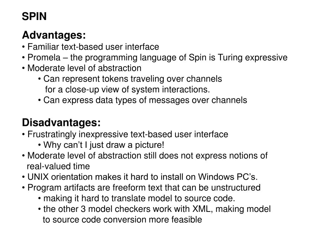 SPIN • Advantages: • Familiar text-based user interface • Promela – the programming language of Spin is Turing expressive • Moderate level of abstraction • Can represent tokens traveling over channels • for a close-up view of system interactions. • Can express data types of messages over channels • Disadvantages: • Frustratingly inexpressive text-based user interface • Why can’t I just draw a picture! • Moderate level of abstraction still does not express notions of • real-valued time • UNIX orientation makes it hard to install on Windows PC’s. • Program artifacts are freeform text that can be unstructured • making it hard to translate model to source code. • the other 3 model checkers work with XML, making model • to source code conversion more feasible
