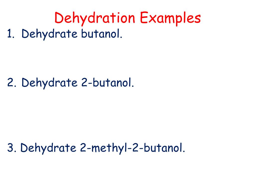 Dehydration Examples • Dehydrate butanol. • Dehydrate 2-butanol. 3. Dehydrate 2-methyl-2-butanol.