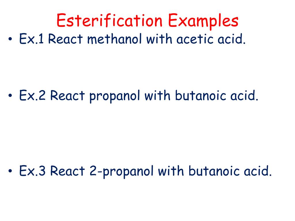 Esterification Examples • Ex.1 React methanol with acetic acid. • Ex.2 React propanol with butanoic acid. • Ex.3 React 2-propanol with butanoic acid.