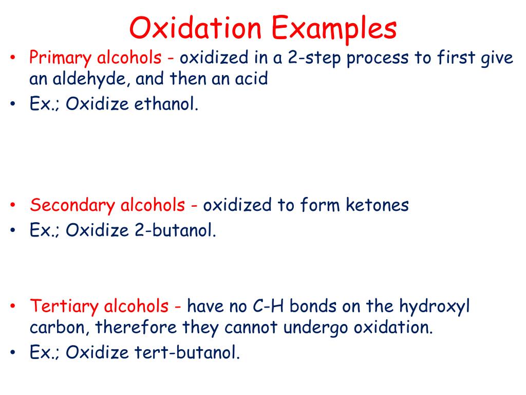 Oxidation Examples • Primary alcohols - oxidized in a 2-step process to first give an aldehyde, and then an acid • Ex.; Oxidize ethanol. • Secondary alcohols - oxidized to form ketones • Ex.; Oxidize 2-butanol. • Tertiary alcohols - have no C-H bonds on the hydroxyl carbon, therefore they cannot undergo oxidation. • Ex.; Oxidize tert-butanol.