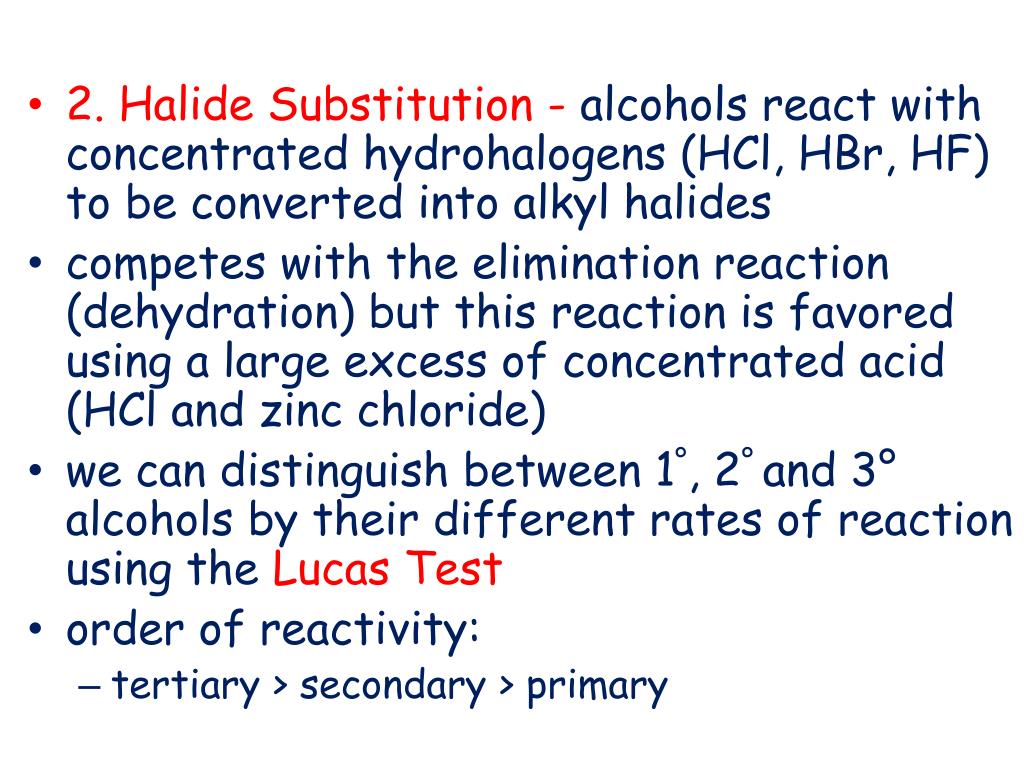 2. Halide Substitution - alcohols react with concentrated hydrohalogens (HCl, HBr, HF) to be converted into alkyl halides • competes with the elimination reaction (dehydration) but this reaction is favored using a large excess of concentrated acid (HCl and zinc chloride) • we can distinguish between 1°, 2° and 3° alcohols by their different rates of reaction using the Lucas Test • order of reactivity: • tertiary > secondary > primary